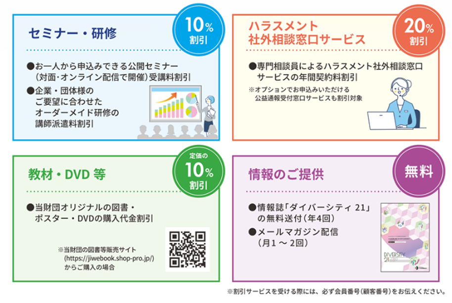 賛助会員様が「ダイバーシティ推進」「ハラスメントのない働きやすい職場づくり」を推進される上で、役立てていただくために下記の特典を設けています(PDFはこちら)。