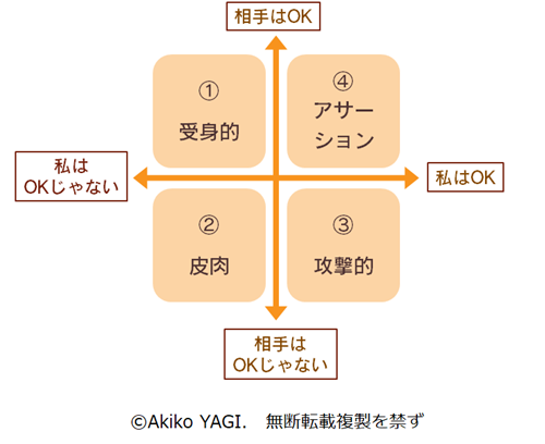 コミュニケーションスタイルの観点から分析すると、①は受身的なコミュニケーションです。相手はカレーが食べられてOKですが、自分はラーメンが食べられずOKではありません。さらに、そもそもラーメンが食べたかったということ自体、相手には伝わらないので、積もり積もると「言えない自分」を責めて気分の落ち込みやうつにつながることが考えられます。
