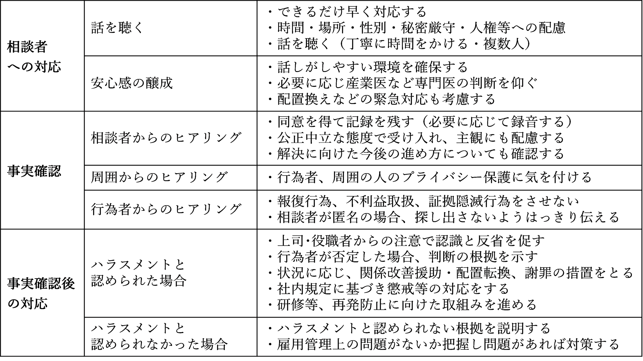 相談窓口担当者は、相談者の話を傾聴し、意向等を的確に把握し、行為者や第三者のヒアリング内容も踏まえて事実関係を整理するなどのスキルとともに、相談者等のプライバシー保護や二次被害防止のための配慮などが求められますので、しっかりとした研修を実施することが重要です(※)。
