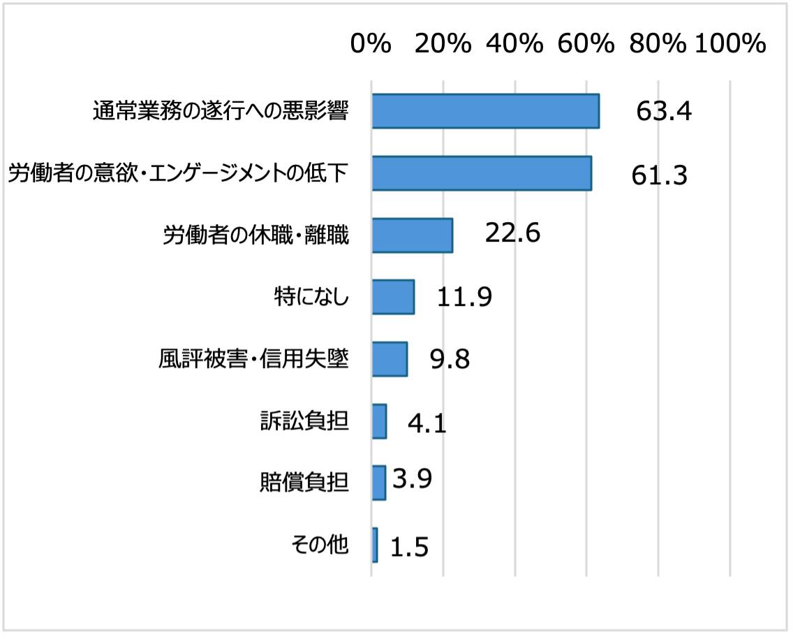 2017年に「UAゼンセン」が実施した悪質クレーム対策(迷惑行為)アンケート調査結果を契機に、様々な業界でのカスハラの実態が報道等により注目され、厚生労働省の調査(※)においても、カスハラが労働者の人格や尊厳を侵害し、心身の不調や離職・休職の原因となるとともに、企業にとっても業務妨害や人材の損失等、深刻な影響を与える経営問題となっています。