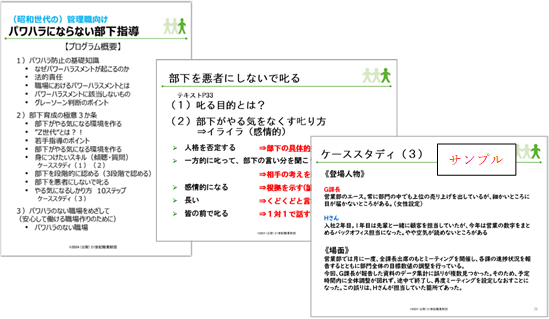 各社向けに実施する場合には、組織風土や過去の相談内容など、お客様の実情に沿って内容(特にケーススタディ)をアレンジして、グループワークやロールプレイなどにしっかリ取り組んで腹落ちしていただけるコンテンツをご提供します。