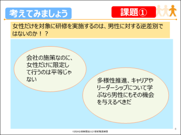- 「腹落ちする内容」というキャッチコピーに惹かれて参加しましたが、期待通りの内容でした。ポジティブアクションとして実施する「女性だけの研修」はなんら問題がないという明快な答を聞くことができ、社内研修を推進していく自信となりました。