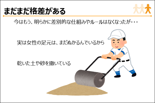 3回シリーズで開催するセミナーの1回目として、まず「女性だけを対象とした研修は逆差別ではないのか」と「女性活躍は、女性が頑張るしかない」という、現場から実際によく聞こえてくる声について、各社の実情の情報交換も交え、正面から向き合いました。「下駄を履いている」のはむしろ男性ではないのか、と言った切り口から、多数派がその優位性に気付きにくい実情なども話し合いました。