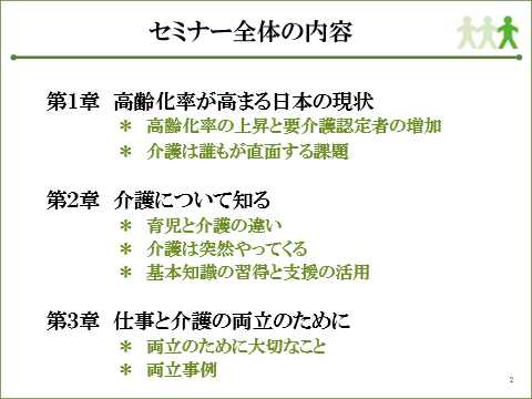 今回は、介護に関する基礎知識、利用できるサービス等の情報、仕事との両立のための考え方等を学ぶことで、介護への漠然とした不安を解消し、仕事との両立への意識を高めることを目的とした「仕事と介護の両立セミナー」の一部を体験いただきました。
