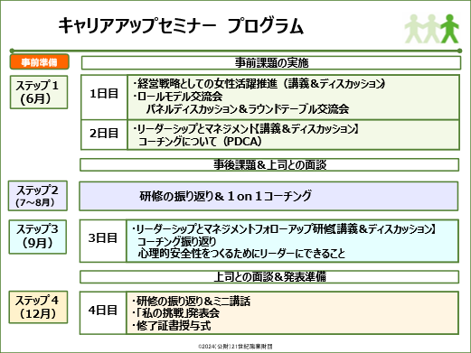 2024年6月~12月にかけて、株式会社ヤクルト本社中日本支店様において、販売会社の女性部門責任者を対象とした「女性キャリアアップセミナー」を実施しました。