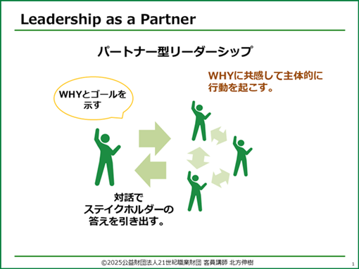 続いて当財団客員講師 北方伸樹氏が登壇し、「パートナー型リーダーシップ」の重要性と具体的な発揮のしかたについて、約5時間にわたりワークを交えて参画型研修を実施した後、参加者より本研修での成果発表も行われ、盛況のうちに終了しました。