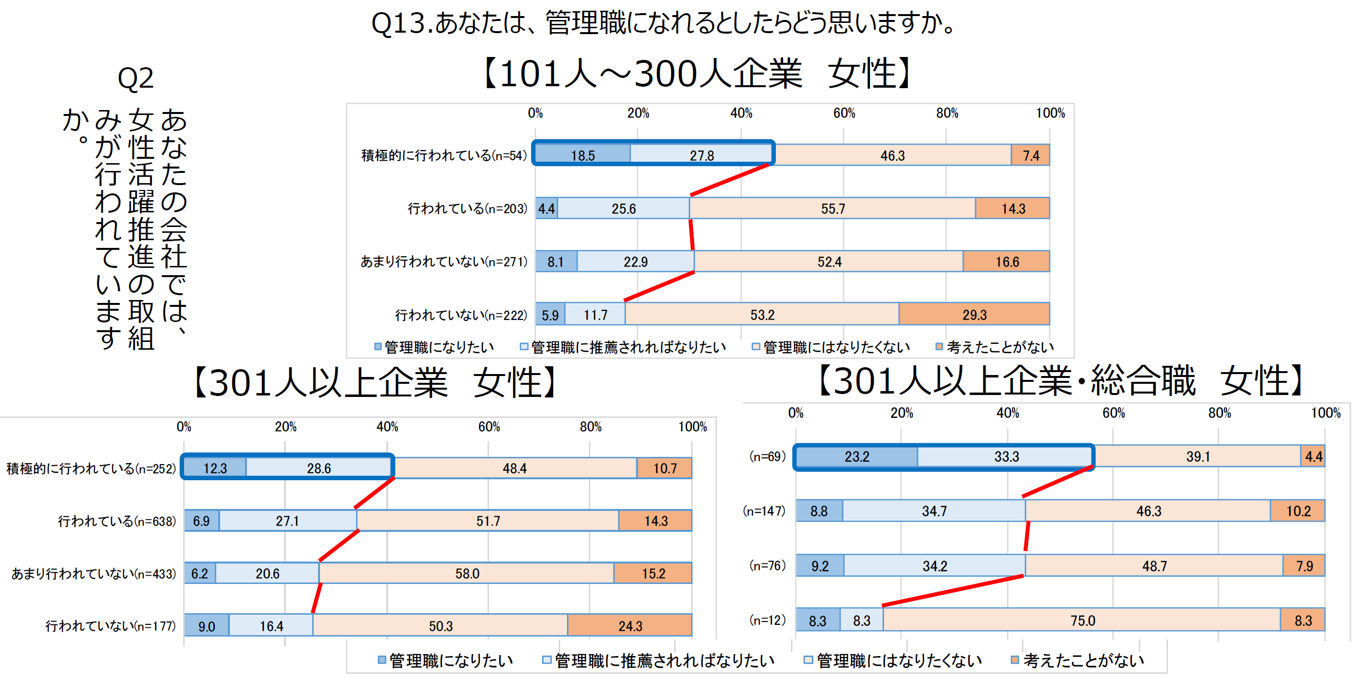 ・女性について、女性活躍推進の取組み状況別に昇進意欲を見たところ、企業規模に関係なく「積極的に行われている」場合は、「行われていない」場合に比べて、「管理職になりたい」「管理職に推薦されればなりたい」の割合が高い。301人以上企業の総合職も同様。