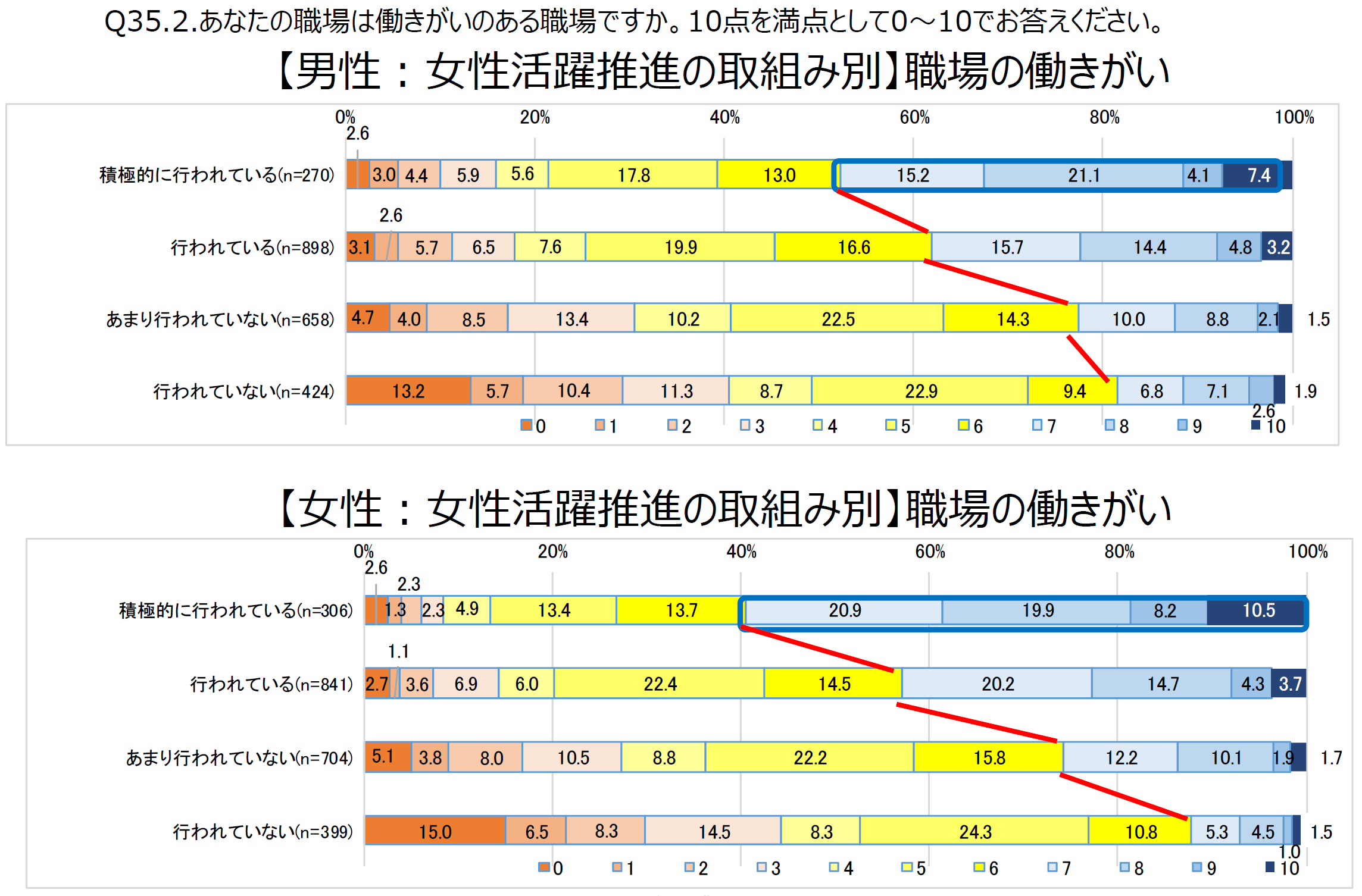 ・男女毎に女性活躍推進の取組み状況別に働きがいを見たところ、「積極的に行われている」場合は、「行われていない」場合に比べて、7~10点の割合が高い。