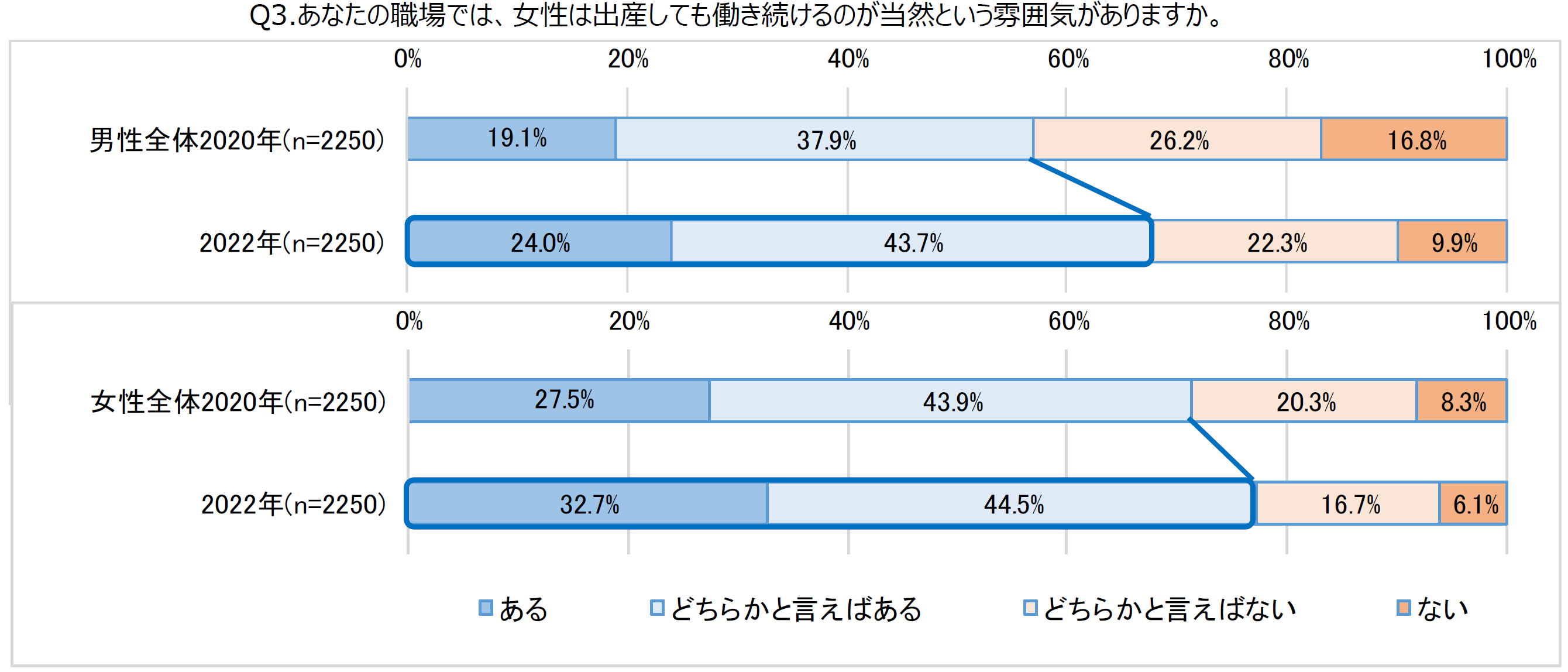 2年前よりも「出産しても働き続けるのが当然という雰囲気」が高まった