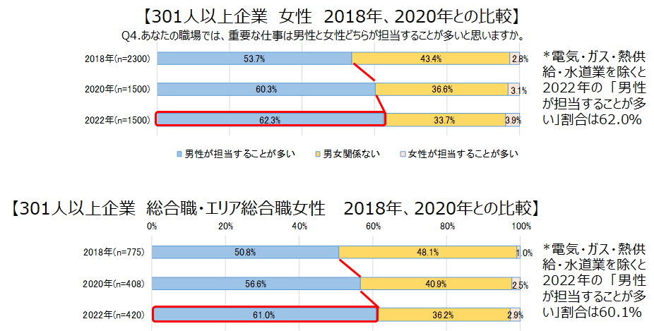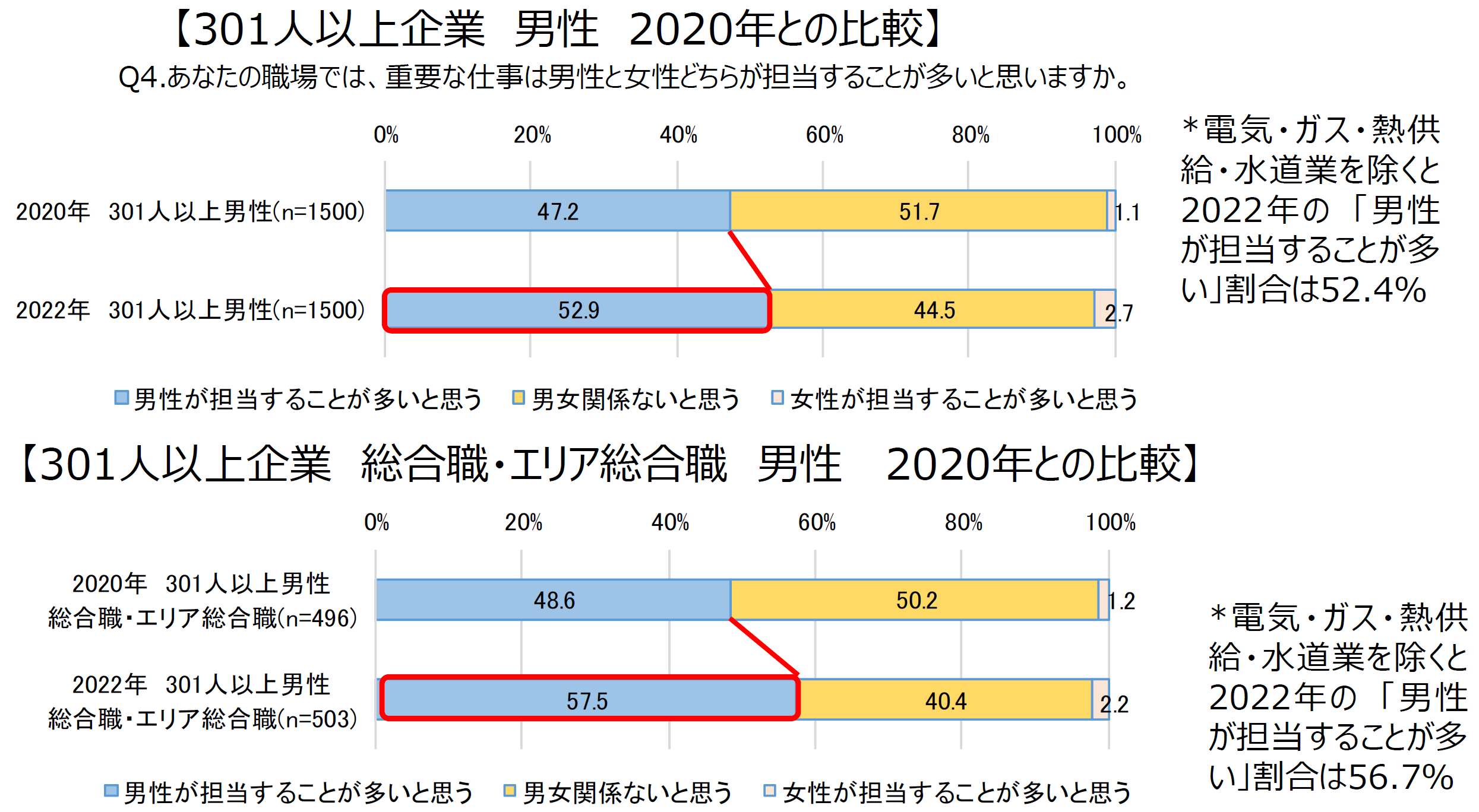 301人以上規模の企業の女性において、重要な仕事は「男性が担当することが多い」と思う割合が高くなった