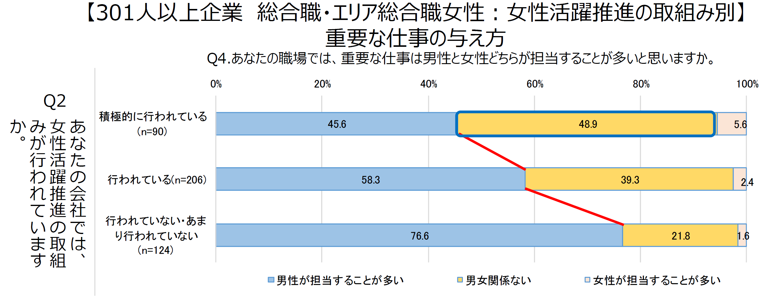 ・301人以上企業の総合職・エリア総合職女性において、女性活躍推進の取組みが「積極的に行われている」場合、重要な仕事を「男女関係なく」担当することが多いと思う割合が高く、48.9%である。