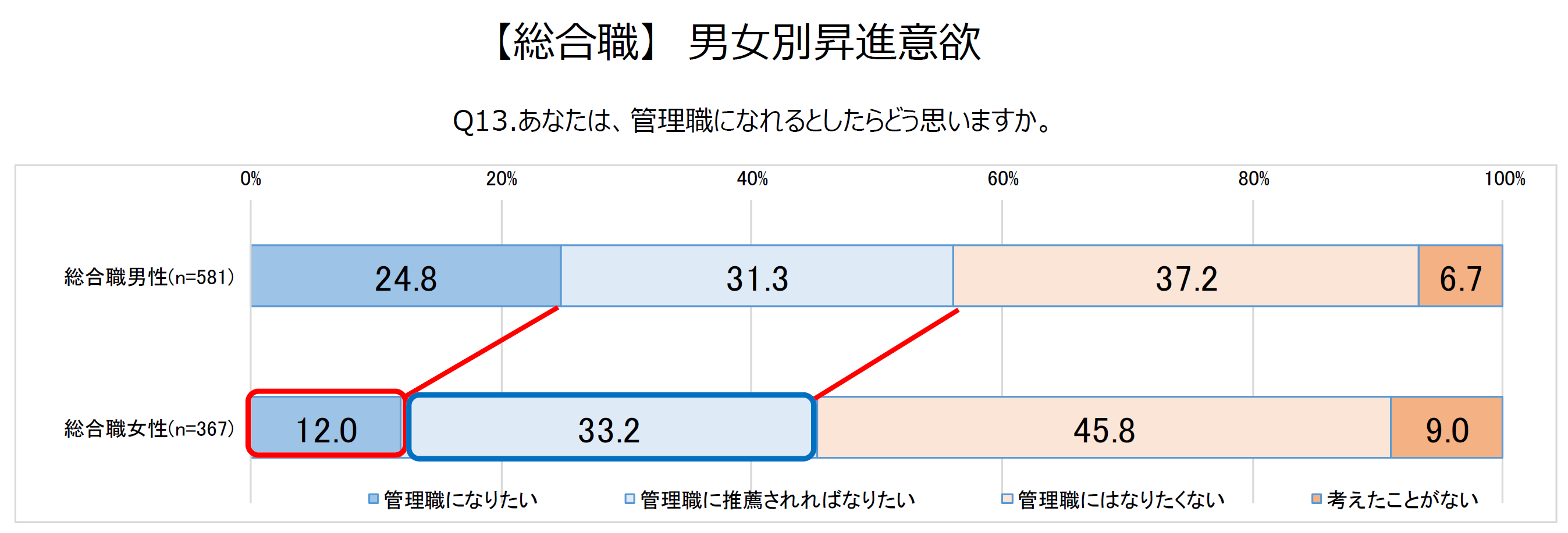 ・昇進意欲を総合職男性と総合職女性で比較すると、「管理職になりたい」割合は、総合職男性24.8%、総合職女性12.0%と、男性のほうが高い割合であるが、「管理職に推薦されればなりたい」の割合は、総合職女性のほうがやや高い。