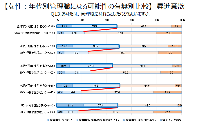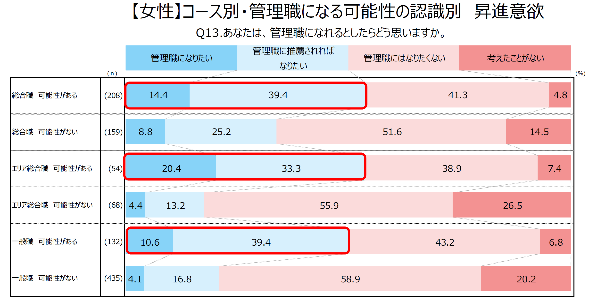 管理職になる可能性があると認識している女性の約半数は昇進意欲がある