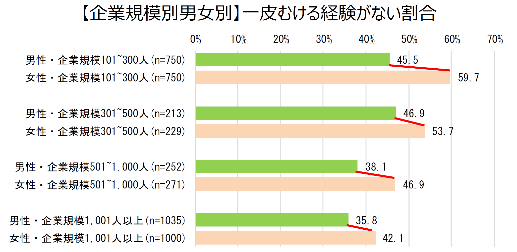 ・企業規模別に「一皮むける経験(*)をしたことがない」人の割合を見ると、どの企業規模においても、女性は男性よりも「一皮むける経験をしたことがない」人の割合が高い。