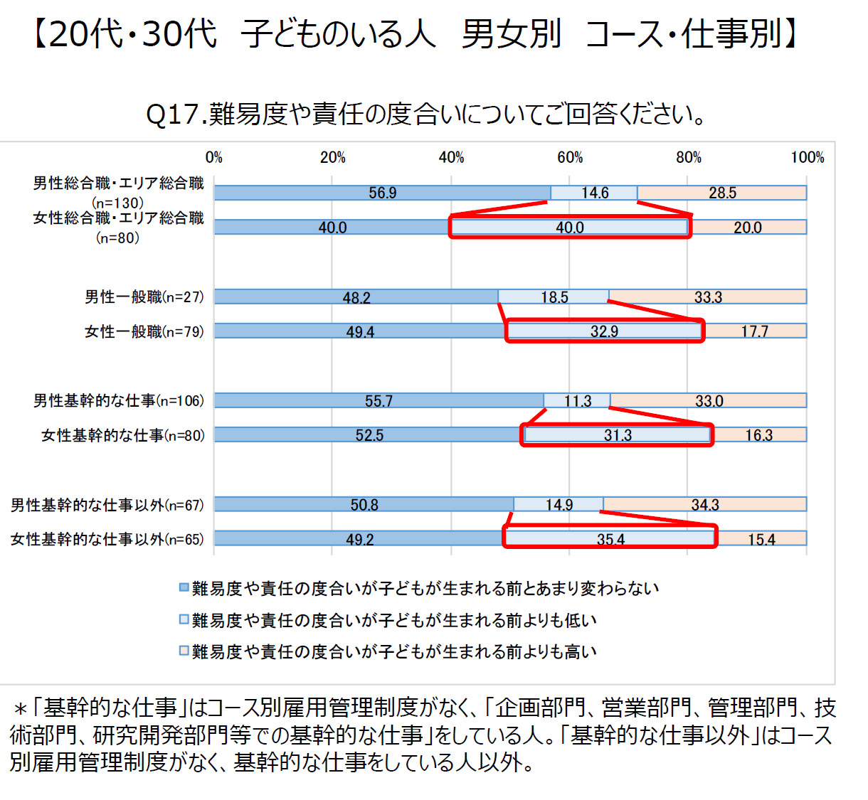 20代・30代の総合職・エリア総合職の女性では、出産前よりも難易度や責任の度合いが低くなった人が4割