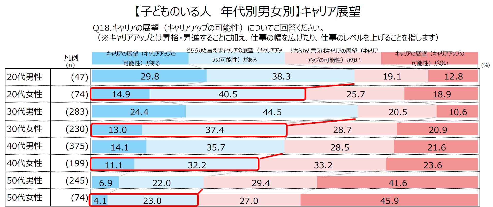 子どものいる人について、キャリアの展望がある人の割合は、どの年代においても女性のほうが少ない
