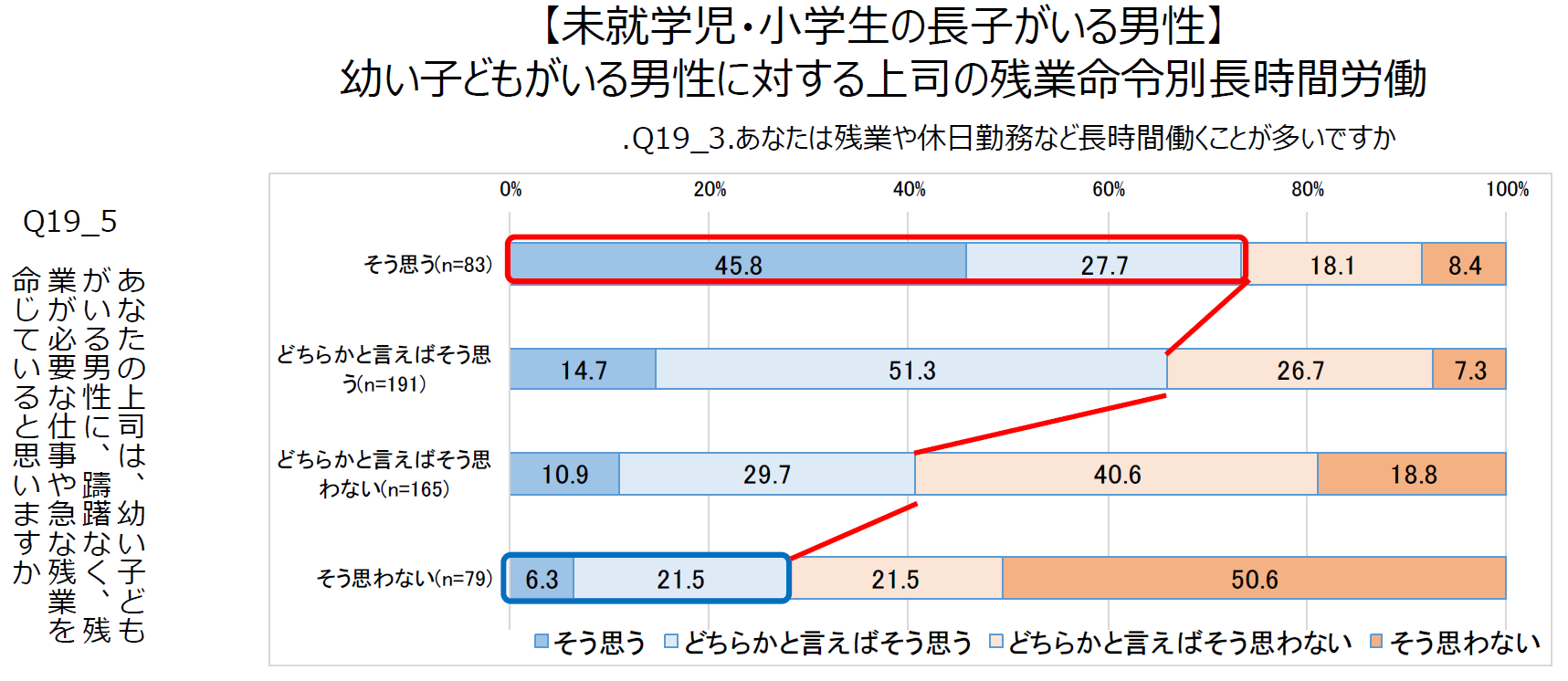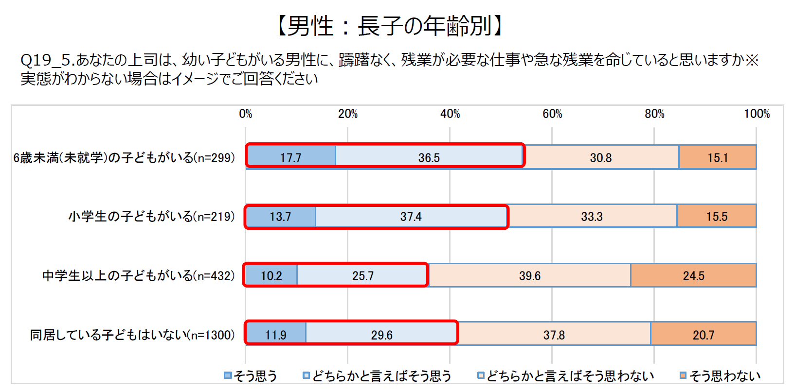 ・長子の年齢が未就学または小学生である男性のうち5割を超える人が、上司が躊躇なく幼い子どもがいる男性に残業を命じていると思っている 。