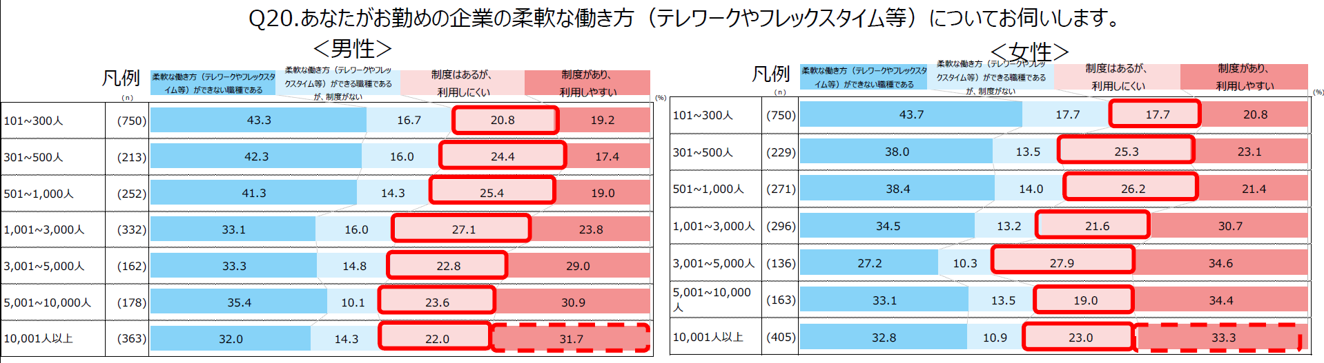 ・テレワークやフレックスタイム等柔軟な働き方について尋ねたところ、10,001人以上企業でも、「制度があり利用しやすい」と回答した人の割合は、男性で31.7%、女性で33.3%と高くない。