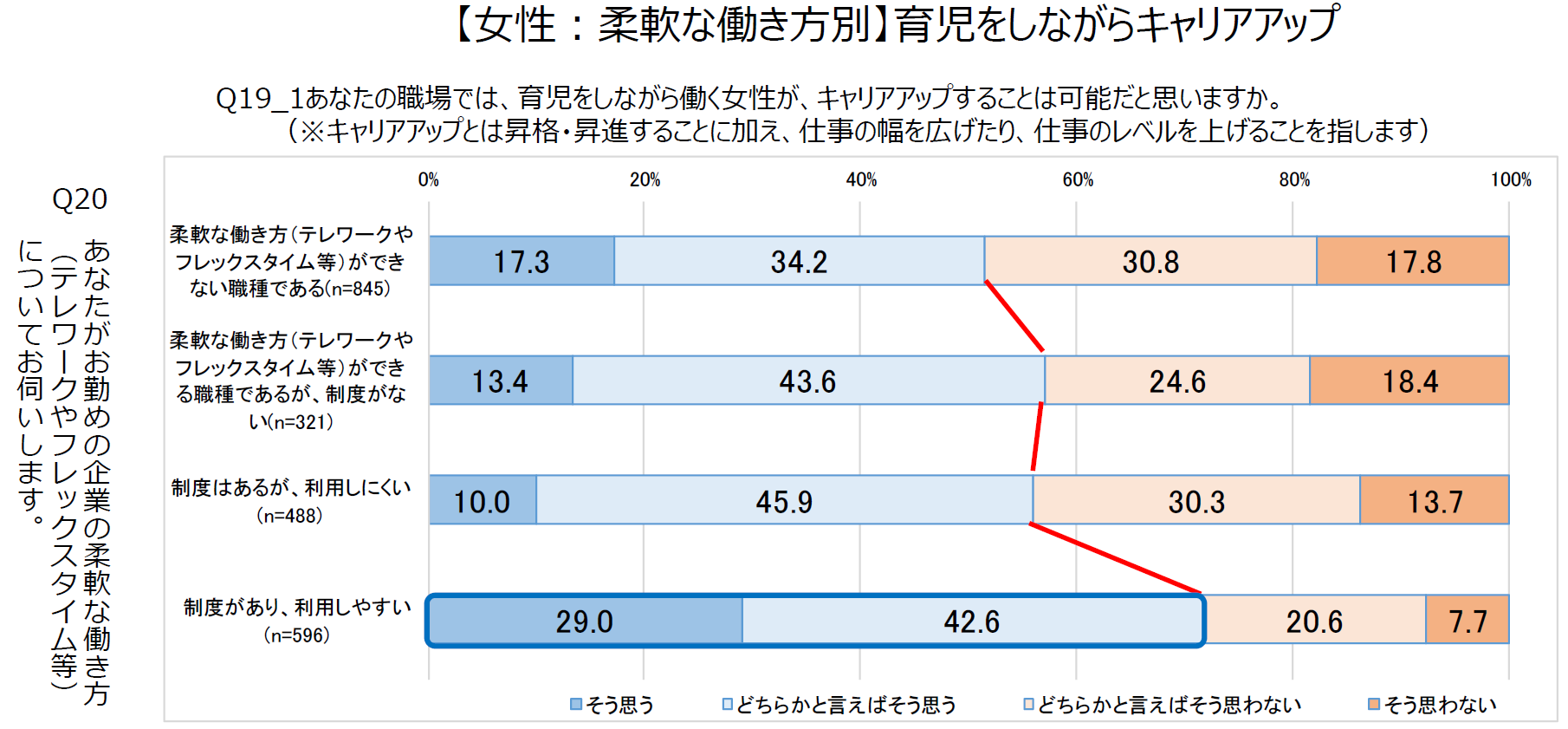 柔軟な働き方の制度が利用しやすいと、育児をしながらキャリアアップすることが可能だと女性が思う割合が高まる