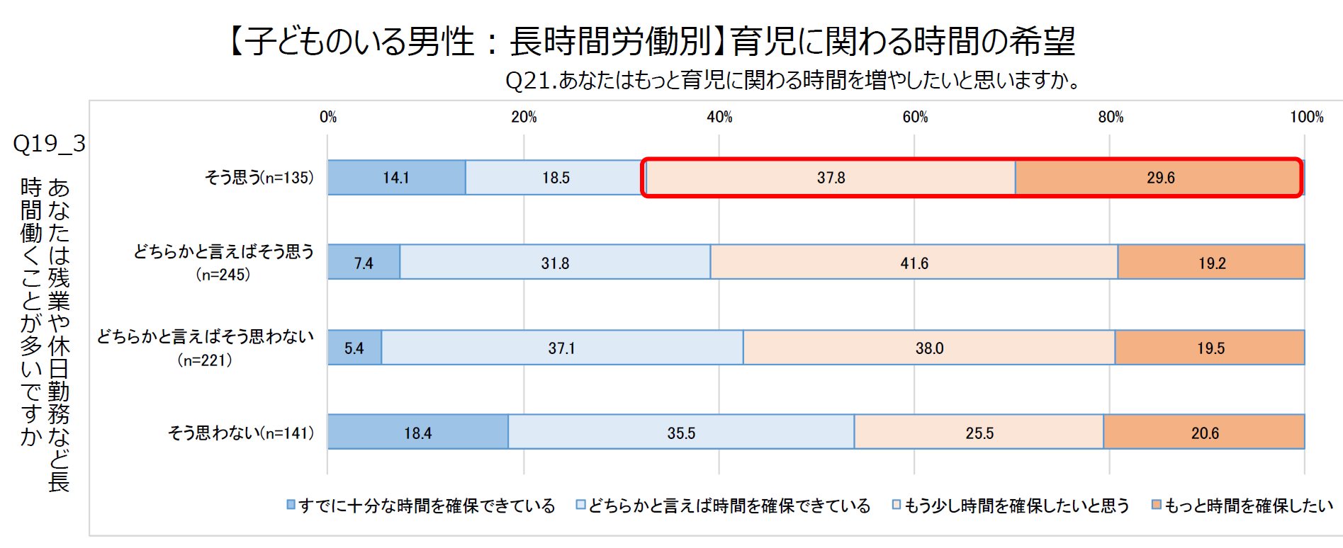 ・子どものいる男性で、長時間働くことが多い場合、「もっと育児に関わる時間を確保したい」人の割合が29.6%、「もう少し時間を確保したいと思う」人の割合が37.8%と、7割近くが現在よりも育児に関わる時間を増やしたいと思っている。