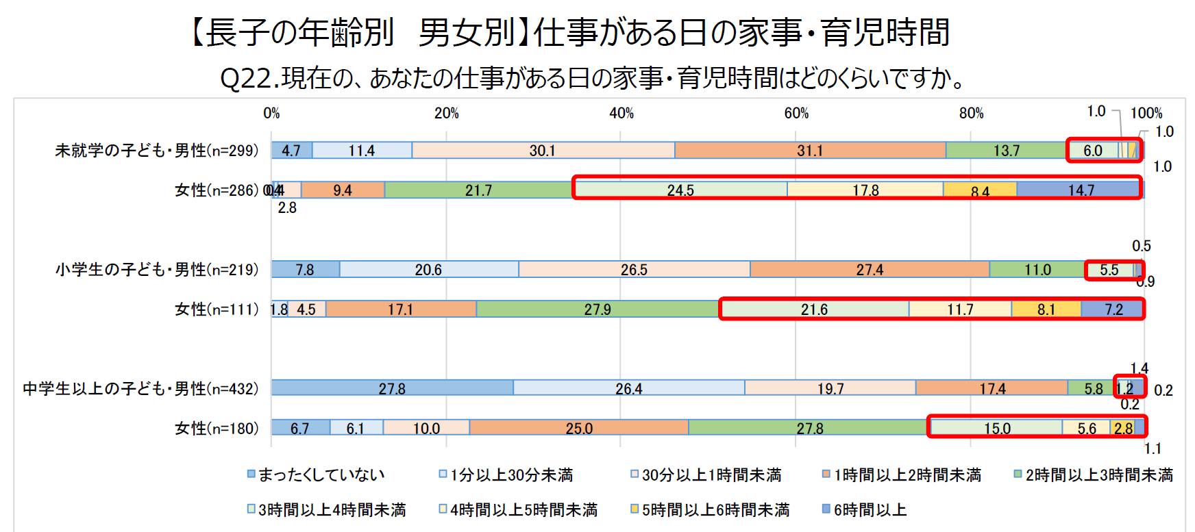子どもの年代に関わらず、家事・育児時間に男女間で大きな差がある