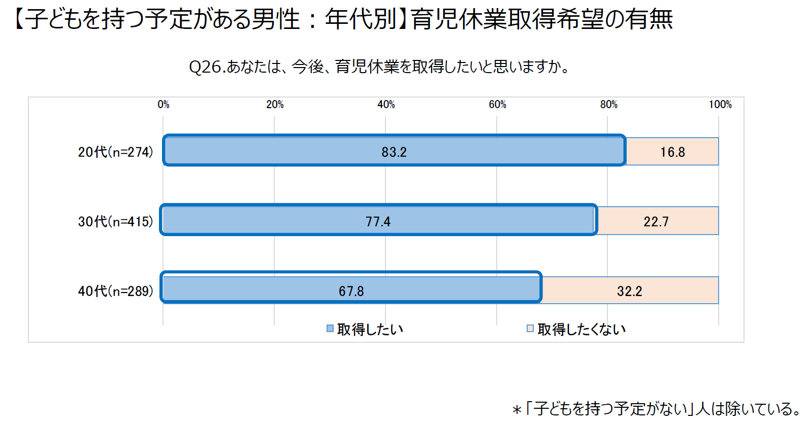 ・年代別に育児休業取得希望の有無を見ると、20代では、育児休業を取得したいと思っている人が子どもを持つ予定がある男性の8割を超えている。30代でも77.4%、40代でも67.8%と高い。