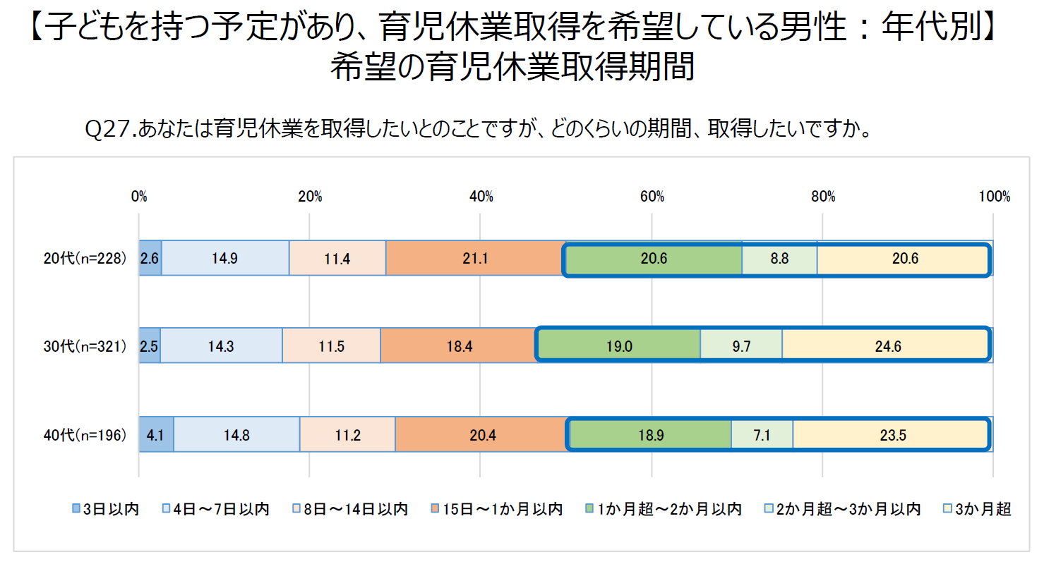 ・現状(Q24:1か月超えの人は約2割)と比べると希望の取得期間は長くなっている。