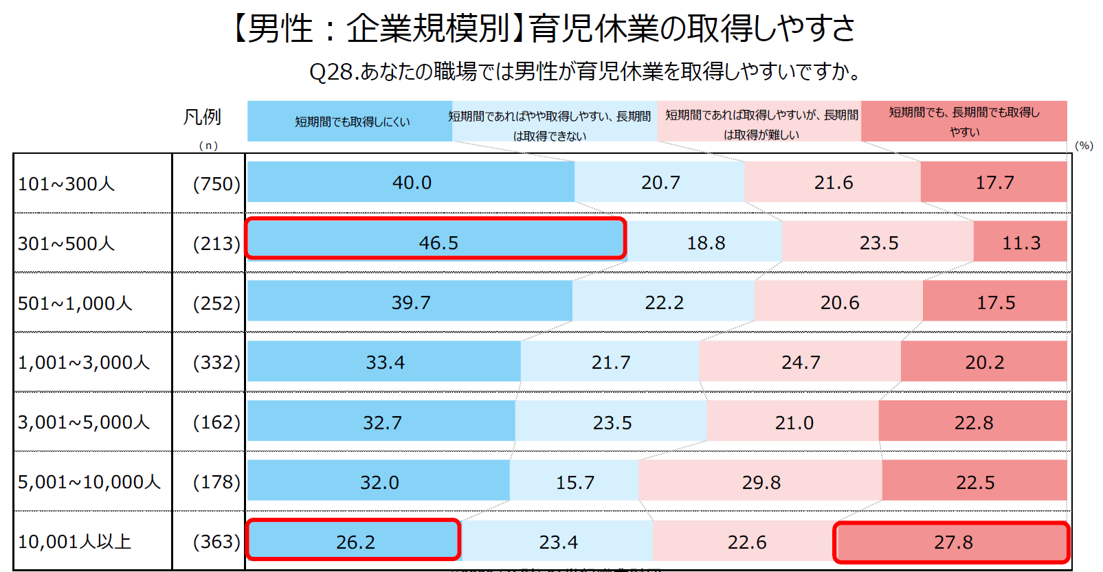 ・男性の育児休業の取得のしやすさを企業規模別に見ると、「短期間でも取得しにくい」と回答した男性の割合は10,001人以上企業で26.2%、301~500人企業では46.5%。