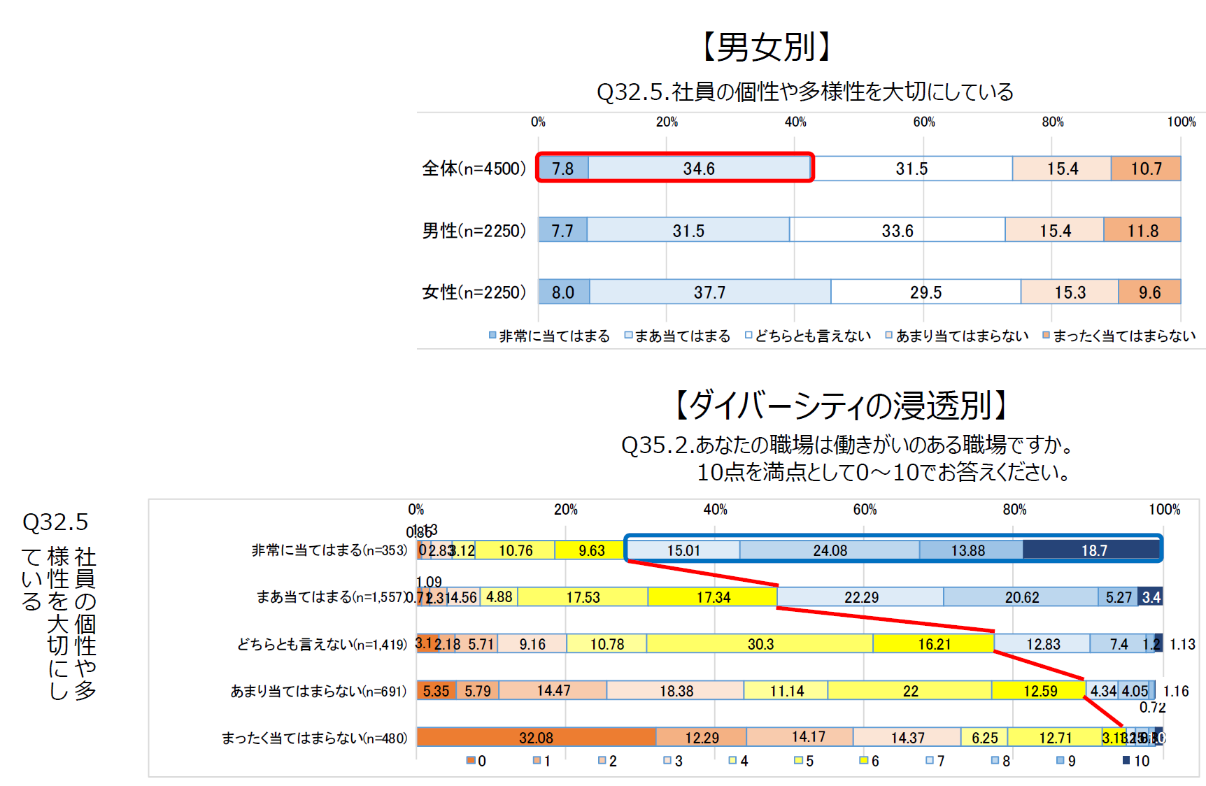 ・職場では「社員の個性や多様性を大切にしている」に対し、「非常にあてはまる」と回答した人では、働きがいの点数が7~10点の人の割合が高く、「まったくあてはまらない」場合、 7~10点の人の割合が低い。