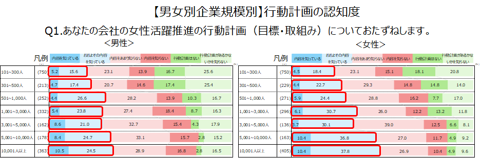 新たに行動計画策定・公表が義務化された101人~300人規模も、それ以上の規模の企業も認知度が低い