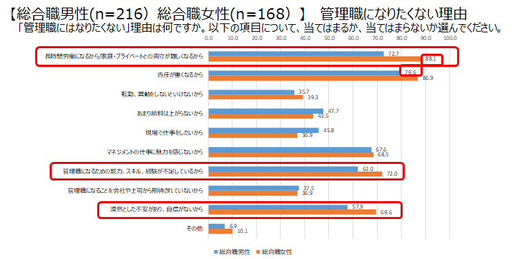 管理職になりたくない理由(総合職)で男女差が大きいのは「長時間労働」、「自信のなさ」、「能力、スキル、経験不足」