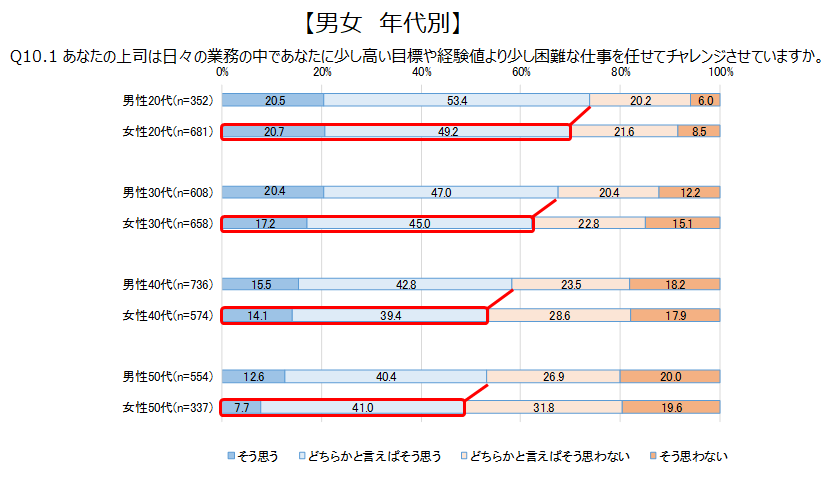 ・年代別男女別に「あなたの上司は日々の業務の中であなたに少し高い目標や経験値より少し困難な仕事を任せてチャレンジさせていますか」に対する回答を見ると、どの年代でも、「そう思う」「どちらかと言えばそう思う」の割合は男性より女性のほうが低い。