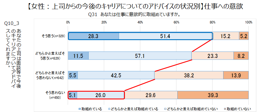 上司から今後のキャリアについてのアドバイスを受けている場合、仕事への意欲が高い