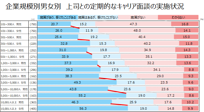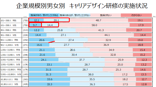 ・101~300人企業では、施策のある割合は男性で32.2%、女性で24.1%と低く、女性で 「施策があり、受けたことがある」人は1割にも満たない。