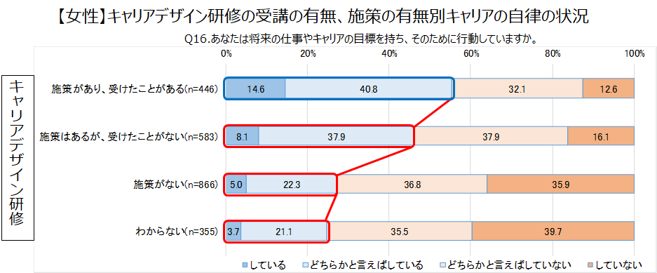 キャリアデザイン研修を受けたことがある場合は、「将来の仕事やキャリアの目標を持ち、そのために行動している」割合が高くなる