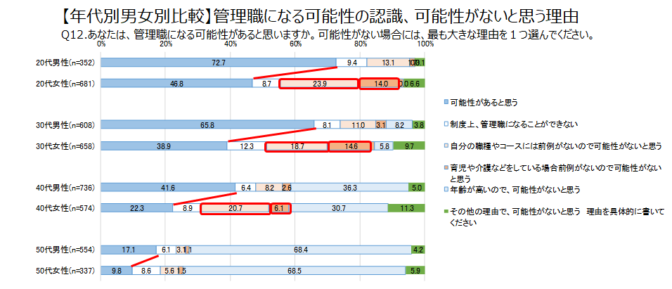- 管理職では、一般社員より割合が高いが、6割に達していない。