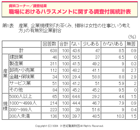 特に、「お茶くみ、掃除は女性の仕事」という考えは「少しある」と「かなりある」を合計すると55.5%となり、「ない」の43.6%を上回っている。特に、金融・保険業では67.6%が「少しある」、「かなりある」としている。