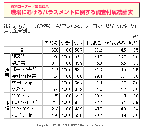 また、建設業で「女性だからといった理由で任せない業務がかなりある」(13.0%)とする割合が高い。(第1図、第1表、第2表)